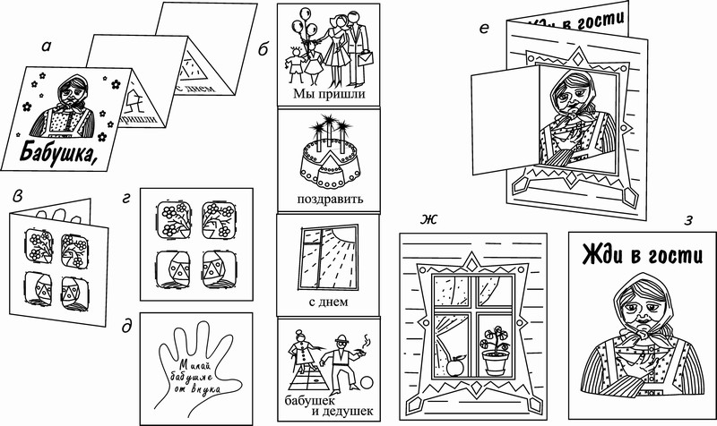 Вариант 1. Открытка-гармошка (рис. а), одна сторона которой представляет собой текст с рисунками (рис. б). Вариант 2. Открытка с ладошкой (рис. в). На развороте ребенок обводит свою ладонь (рис. д). Вариант 3. Открытка-игрушка (рис. е). На первой странице (рис. ж) вырезаем окошко, в котором видно изображение на следующем листе (рис. з).